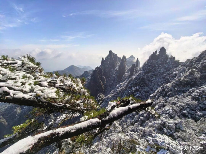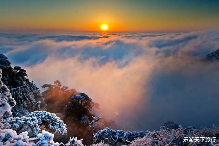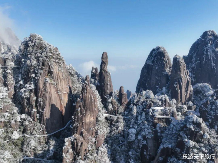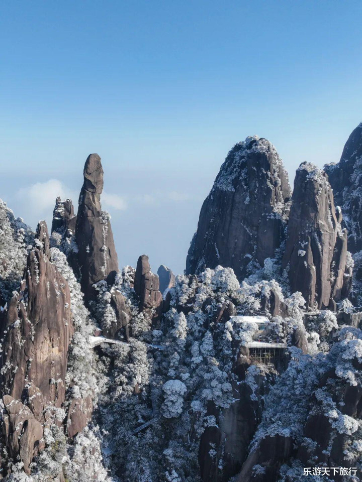 三清山的12 月 — 次年 2 月为旺雪期,花岗岩峰林与古松被冰晶包裹,女神峰、巨蟒出山等绚烂性景不雅更显空灵;即便无雪,高海拔低温也常酿成雾凇,比雪更通透。