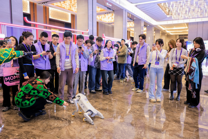 2025年12月31日,苏州“OPC之夜”步履现场,高校学生与机器狗互动。(受访者供图)