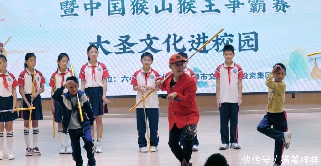 行动现场担任评委,手把手指挥孩子师法孙悟空动作。