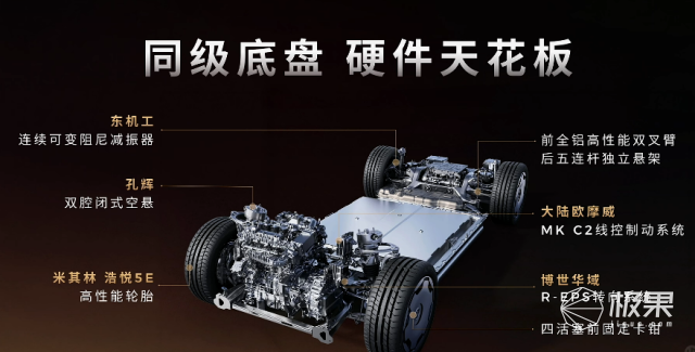 底盘也不空泛,前双叉臂、后五连杆,全系标配CDC减振。除初学版外,都配双腔闭式空悬,升降规模40mm到-55mm,带主动魔毯预瞄、零动调头,顶配还能圆规掉头。制动是前四活塞卡钳加MK C2线端正动,配博世R-EPS转向和LMC2.0底盘端正系统,又稳又塌实。