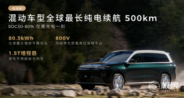 增程版搭载1.5T增程器,前后双电机四驱,总功率300kW。两种电板:63.7kWh纯电续航400km,空洞1300km;80.3kWh纯电续航500km,空洞1180km。800V平台,30%-80%充电15分钟。始创增程CTC电板时刻。
