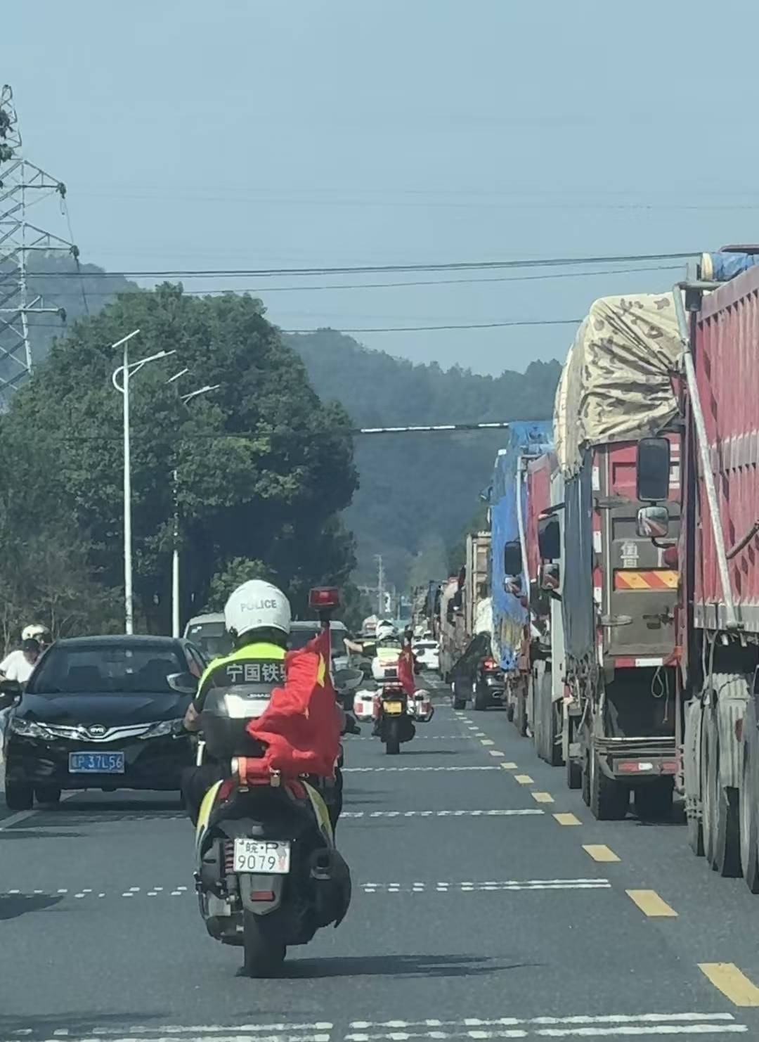 r视频中,拍摄者前列,两位身着“宁国铁骑”字样的交警骑着摩托车。同向车说念上,一些路段十分拥挤,铁骑队员在前列逆行开说念、引路,带着乞助宇宙乘坐的车安全前行。