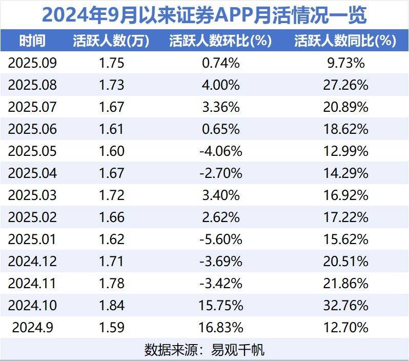 易不雅千帆数据显现,9月证券类App月活跃用户范围达到1.75亿东说念主,环比增长0.74%,同比增长9.73%,不仅刷新2025年单月最高记录,更创下“9・24”行情以来第三高位。