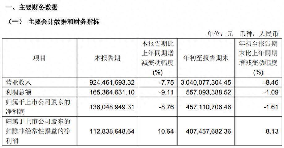 其中第三季度,公司生意收入为9.24亿元,同比着落7.75%;归母净利润为1.36亿元,同比着落8.76%;扣非归母净利润为1.13亿元,同比飞腾10.64%。