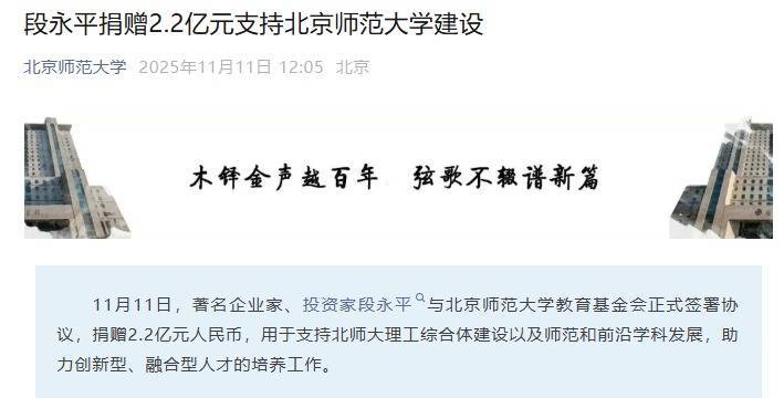 【大河财立方音问】11月11日,被称为“中国巴菲特”的段永平与北京师范大学教学基金会认真签署条约,捐赠2.2亿元,用于营救北师大理工详尽体配置以及师范和前沿学科发展,助力编削式、和会型东谈主才的培养责任。