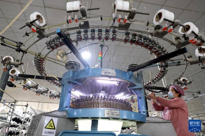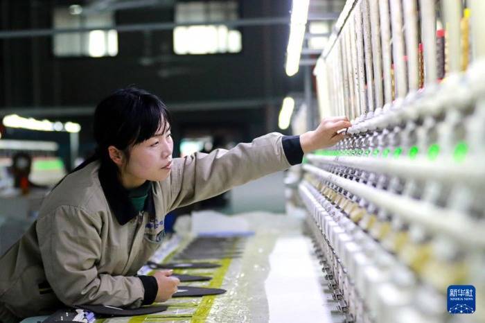 1月4日,在山东省枣庄市市中区税郭镇一家企业,工东说念主在分娩服装面料居品。